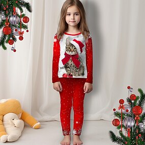 Natal Para Meninas 3D Gato Pijama de Natal Conjuntos de pijama Manga Longa Impressão 3D Outono Inverno Ativo Moda Estilo bonito Poliéster Infantil 3-12 anos Gola Redonda Casa Casual Interior Normal