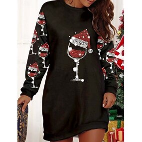 Vestido de Moletom Feminino Vestido Maxi Vestido Casual Vestido Petit Vestido Shift Vestido Elegante Estiloso Natal Férias Festa Caimento Regular Papai Noel Manga Longa Gola Crew Preto e Branco Preto