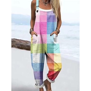 Mulheres No geral Ativo Xadrez Sem Manga Sem Mangas Decote Quadrado Bolsos Imprimir Diário Férias Ajuste Largo Roxo Laranja Verão