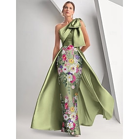 Linha A Longo Vestidos de noite Vestido de Baile Vestido formal Split alta Mãe da noiva Sem Manga Decote V Formal Convidado do casamento Bolsos Cetim com Estampa floral Fenda Bolsos