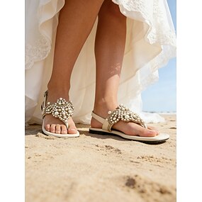 sandálias rasteiras femininas com tiras em T e pérolas – elegantes sapatos de casamento abertos para noivas e casamentos na praia