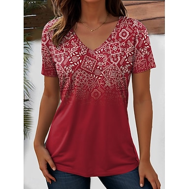 Mulheres Camiseta Imprimir Gráfico Geométrica Estampado Cashemere Vintage à moda Clássico Manga Curta Decote V Tops longos Diário Vermelho Rosa cor de Rosa Verão Primavera