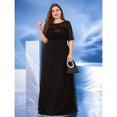 Vestidos em Linha A Plus Size Vestido Elegante Curvas Formal Casamento Comprimento do Chão Manga Curta Decote Redondo Chiffon com Pérolas