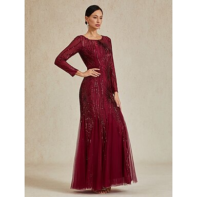Mulheres Vestido Longo Vestidos De Sereia Trompete Elegante Festa Formal Coquetel Normal Côr Sólida Manga Longa Gola Redonda Vinho Primavera Outono Inverno