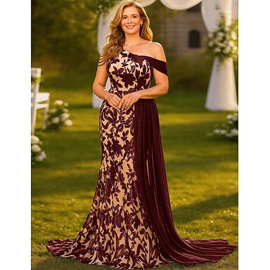 Tubinho Longo Bordado com miçangas Vestido formal Vestido para a mãe da noiva Vestidos de noite Vestido de baile com sobressaia Vestido formal Elegante Bloco de Cor Split alta Manga Curta Ombro a
