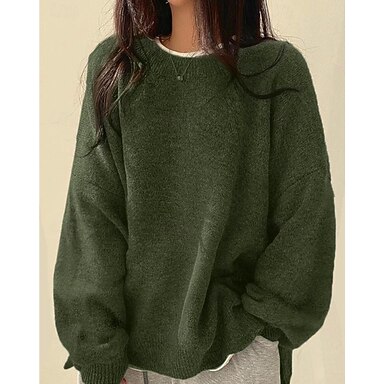 Women's Sweater Fashion Casual Solid Color Ribbed Crew Neck Knitted Long Sleeve Regular Tops Knit Outdoor Daily Weekend Black Dark Green Fall Winter