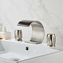 Widespread Bathroom Sink Mixer Faucet, Waterfall Arc Spout Brass 3 Hole 2 Handle Basin Tap Deck Mounted, Washroom Basin Vessel Water Tap with Hot and Cold Hose |