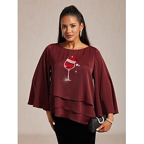 Crăciun Pentru femei Cămașă din satin Bluză Stras Pahar de vin Elegant Lungime Manșon 3/4 Sonerie Stil Nautic Topuri obișnuite Îmbrăcăminte de seară de petrecere Ieșire Roșu Vin Vară Primăvară Toamn