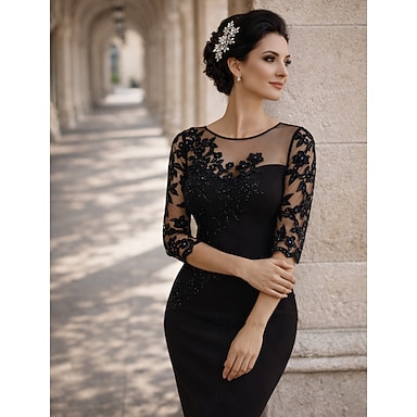 Coloană Teacă Lungime Genunchi Rochie pentru invitata de nunta Rochie Mama Miresei Lungime Manșon 3/4 Bijuterie Epocă Plus Size Invitat la nunta Satin Dantelă Rochii jacheta cu Aplică
