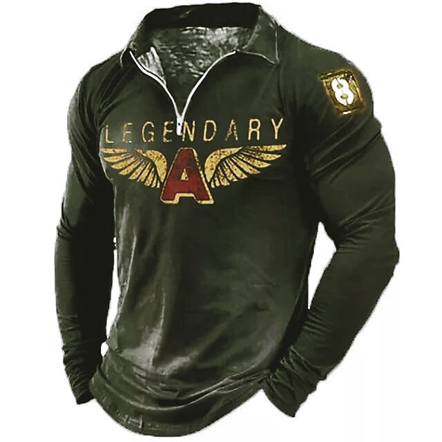 Tricou grafic cu mânecă lungă pentru bărbați cu imprimeu 'A Legendară A' stil vintage guler cu fermoar partial