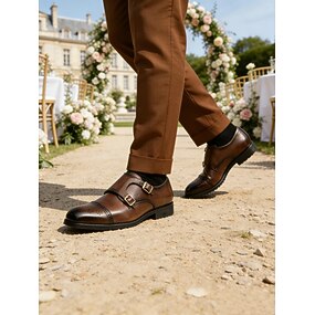 pantofi de rochie pentru bărbați din piele artificială maro cu curea dublă călugăr, cu detalii brogue, stil clasic pentru nuntă, ținută formală și de afaceri