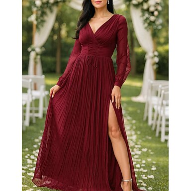 A-linje Golvlång Formella Klänningar Kvällsklänning Brudmödrar Klänning Långa Ärmar V-Hals Elegant Vintage Fest med Fållar Delad Framsida