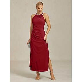 Dam Maxiklänning Sheath Dress Elegant Bröllopsgäst Cocktailfest Volang Utsmyckad Delad Ensfärgat Ärmlös Rund hals Rubinrött