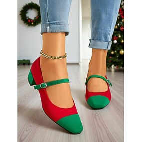 Damskor i röd och grön Mary Jane-modell med låg klack, retro pumps i julfärger med kontrasterande färger för högtider och festliga vinterkläder