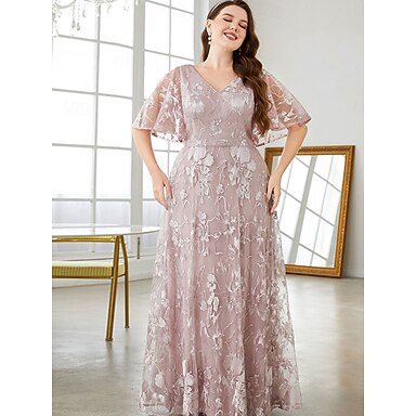 Plus Size Klänning Mor till Bruden Kurvig Klänning Elegant V-hals Golvlängd Spets Kortsleeve med Spets