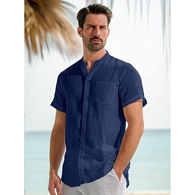 45% linne Ficka Herr linneskjorta Skjorta Knapp upp skjorta Sommarskjorta Vit Mörk marin Blå Kortärmad Slät Hög krage Sommar Utomhus Dagligen Kläder