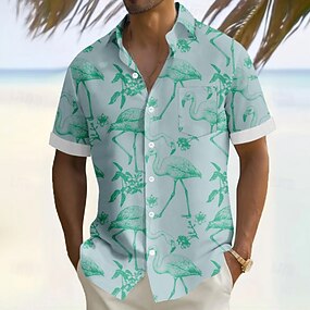Herr Flamingo Fågel Hawaii skjorta Knapp upp skjorta Aloha skjorta Kortärmad Hawaiisk Semester Helgdag Standkläder Sommar Nedvikt 3D-utskrift Främre en ficka Linne som skjorta Rodnande Rosa Blå Grön