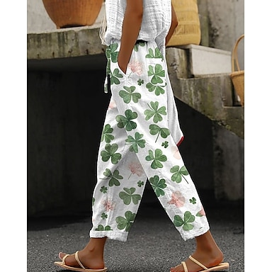 Dam Byxor av linne i bomull Byxor Lättvikt Ledigt Fullängd Mellanhög midja Grafisk Vitklöver Ficka Snörning Mateial som andas Bekväm Oelastisk Ledigt / vardag Helgen Grön Klöver Sommar Vår Normal