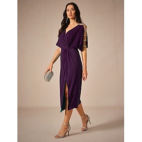 Dam Telängd Stickad klänning Elegant Stylish Fest Datum Normal Ensfärgat Kortärmad V-hals Äggplanta Sommar