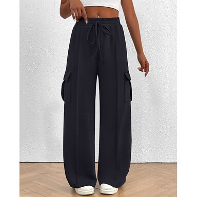 Dam Brett skaft Byxor Palazzo byxor Mode Streetwear Fullängd Hög midja Slät Elastiskt midjeband Snörning Mateial som andas Bekväm Gata Dagliga kläder Utekväll Svart Mörkblå Vår Höst Normal