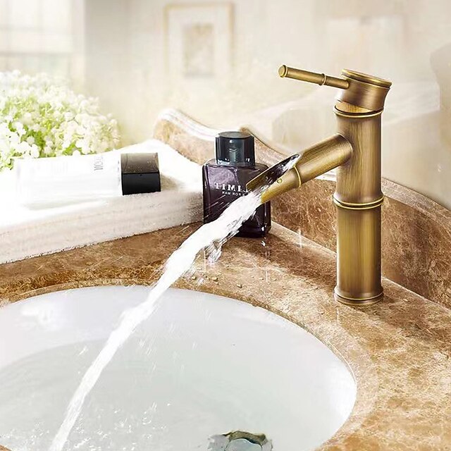 vintage badrumsblandare blandare i bambuform, monoblock kranar för tvättrum i retrostil, antik mässing med ett handtag med ett hål monterad med varm- och kallvattenslang