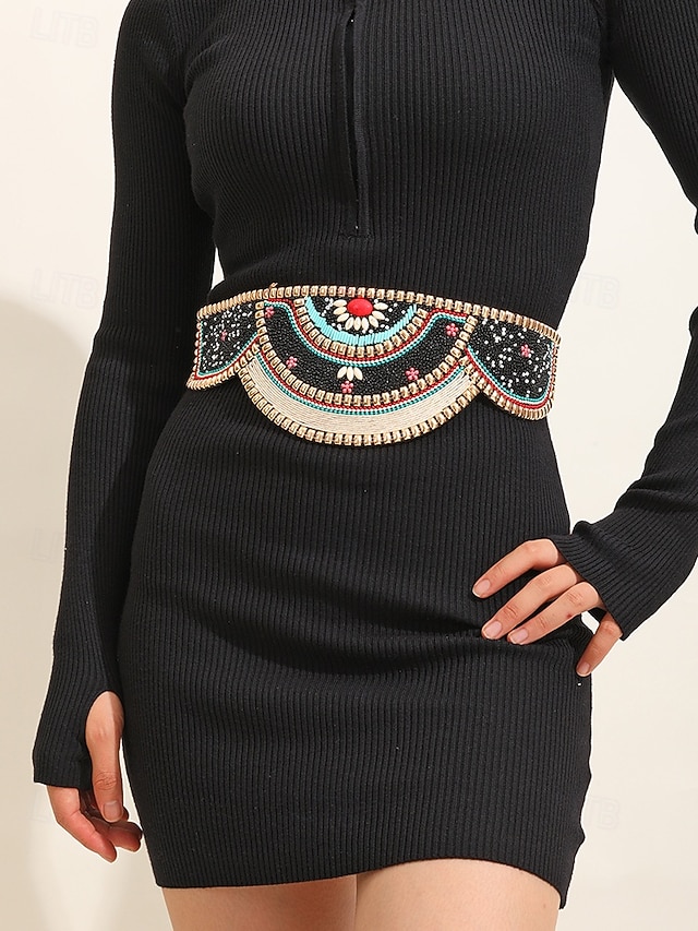 Handgjort bohemiskt pärlbälte för kvinnor, stretchigt elastiskt band med tofsar och berlocker - färgglad broderad design för kvinnor, perfekt för strandkläder, festivaler och sommartillfällen