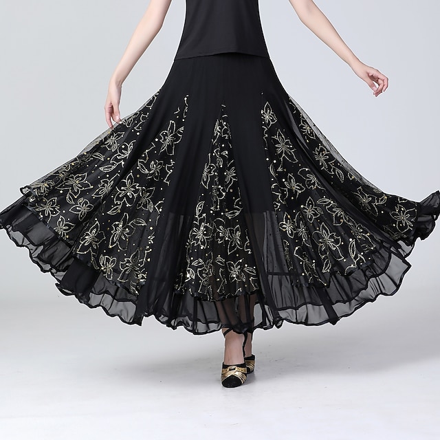 [Tyg]: Tillverkad av en högkvalitativ polyesterblandning, säkerställer denna ballroomsdanskjol en lätt och mjuk textur som är fördelaktig för eleganta rörelser. Valet av tyg stödjer både komfort och hållbarhet, vilket är avgörande för långa danssessioner. [Silhouette]: Designad med en voluminös A-linjeform, har kjolen flera paneler som tillför dynamisk flöde och stil till varje dansrutin, vilket förbättrar utövarens grace på scenen. [Design Höjdpunkter]: Kjolen har en slående kunglig blå färg som kompletteras av intrikata blommönster och subtila paljettsmycken längs fållen. Dessa designelement tillför en touch av gnista och sofistikering, vilket gör kjolen till en visuell höjdpunkt. [Tillfällen]: Perfekt för ballroomframträdanden och dansutbildning, är denna kjol ett idealiskt val för både formella evenemang och träningstillfällen. Dess eleganta design och funktionalitet gör den till en mångsidig del av varje dansares garderob. [Storlekar]: Finns i storlekarna S, M, L och XL, erbjuder denna kjol flexibilitet och passform för olika kroppstyper, vilket säkerställer att varje dansare hittar sin perfekta match.