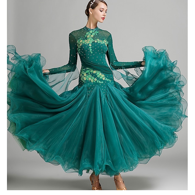 [Tyg]: Denna eleganta ballroom-dansklänning är tillverkad av en lyxig blandning av organza, spandex och mesh, vilket erbjuder en andningsbar och flexibel passform som säkerställer lätt rörelse under framträdanden. Det lätta materialet låter klänningen flöda graciöst med varje steg, vilket förstärker dansarens närvaro på scen. [Silhuett]: Utformad för att ge en smickrande och sofistikerad look, har denna klänning en åtsittande bodel som kompletteras av en full, kaskadskör som rör sig vackert. De långa ärmarna och den höga halsringningen ger en touch av blygsamhet, vilket gör den till ett idealiskt val för både träning och formella framträdanden. [Designhöjdpunkter]: Klänningen har utsökt broderi och delad led-detaljering, med glittrande kristaller och rhinestones som pryder bodelen för ökad elegans och glamour. Detta intrikata pärlverk kompletterar de livliga färger som finns tillgängliga, vilket gör klänningen till ett utmärkande plagg i varje dansgarderob. [Tillfällen]: Perfekt för ballroom-dansframträdanden, tävlingar och träningstillfällen, levererar denna klänning både stil och komfort. Dess design möjliggör optimal uttrycksfrihet och rörelsefrihet, vilket gör den lämplig för dansare som söker att prestera på sitt bästa i alla miljöer. [Storleksområde]: Finns i en mängd olika storlekar, inklusive S, M, L, XL och XXL, är denna klänning designad för att passa dansare av olika former och storlekar. En omfattande storlekstabell tillhandahålls för att säkerställa bäst passform, så att dansare kan välja rätt storlek med förtroende för sina behov.