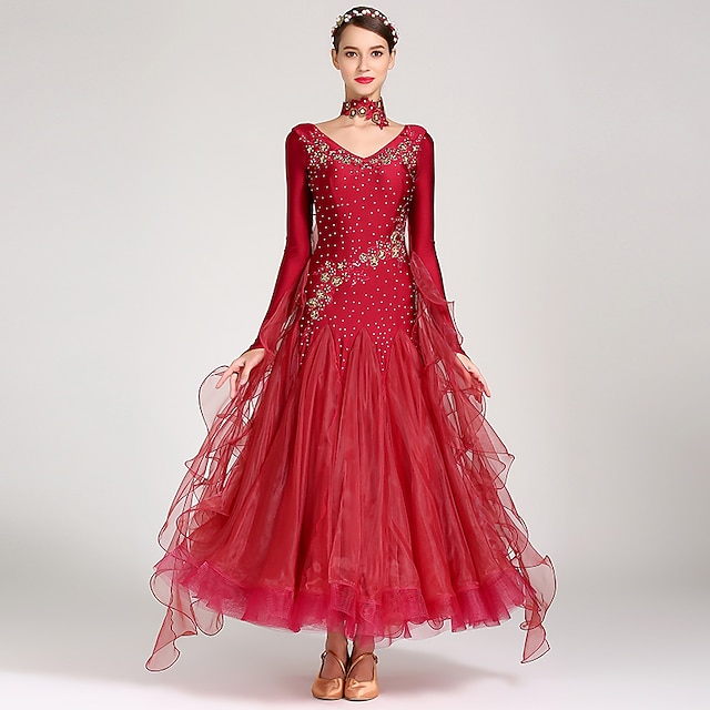 Tiodans Klänning Strass Broderad Dam Prestanda Träning Långärmad Elastan Organza