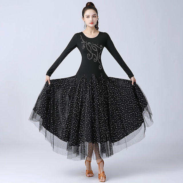 [Tyg] Denna ballroomdansklänning är tillverkad av en lyxig blandning av tyll och polyester, vilket ger både elegans och komfort. Det släta, stretchiga tyget i den övre delen säkerställer en smickrande passform, medan tyllskikten ger volym och en glittrande attraktion till kjolen. [Passform] Designad med en voluminös A-linjeform, förstärker denna klänning dansarens rörelser med sina svepande lager. De långa ärmarna och den höga halsringningen tillför en touch av klassisk sofistikering till det övergripande utseendet. [Designhöjdpunkter] Med en iögonfallande kombination av svart och livlig kungablå är denna klänning prydd med delikata rhinsten-detaljer som ger gnista och elegans. Yttre kjolen är dekorerad med små vita prickar, vilket skapar en stjärnlik effekt mot den blå bakgrunden, kompletterad med ett genomskinligt tyllöverlägg för ytterligare stil och rörelse. [Tillfällen] Perfekt för ballroomdansuppträdanden och träningstillfällen, erbjuder denna klänning en kombination av stil och funktionalitet. Oavsett om det är för träning eller tävlingsevent, är klänningen designad för att smickra och möjliggöra fri rörlighet. [Storleksområde] Finns i storlekarna M, L, XL, XXL och XXXL, tillgodoser denna klänning vuxna kvinnor och säkerställer en lämplig passform för olika kroppstyper.