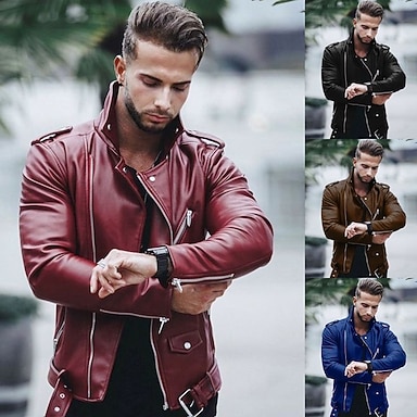 Herr Jacka Imitationsläderjacka Bikerjacka Motorcykeljacka Företag Dagligen Håller värmen Vindtät Ficka Höst Ensfärgat Streetwear Affär Nedvikt Kort Imitationsläder Normal Svart Vin Blå Brun Jacka