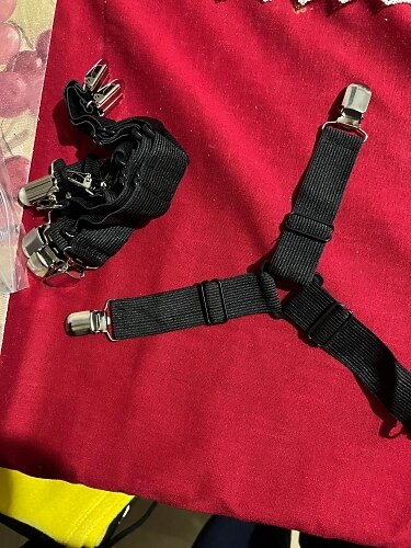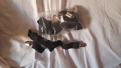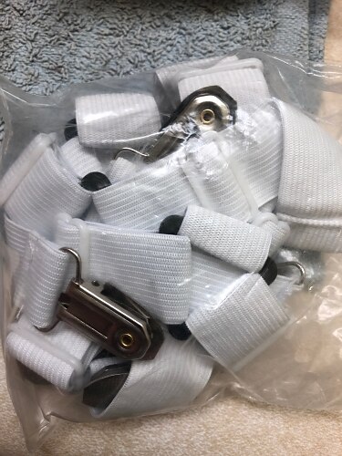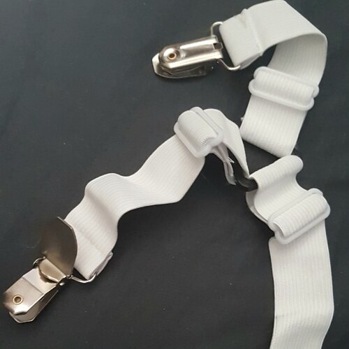 White. Our BOTTOM SHEET, MATTRESS TOPPER, and PROTECTOR are always pulling out of their respective mattress corners. These adjustable stretchy straps are fitted with metal clamp clips. The mattress corner point, and each side of it are all separately clamping your sheets under the mattress securely. There are little rubber bits in each clamp to treat your bed linen with care. IRONING BOARD COVERS are also secured with these clever straps. TABLE CLOTHS that are too long can be folded underneath the table and secured discreetly. SOFA COVERS that slip off can be secured with these straps under each corner of sofa base. Even NEW material to COVER CHAIRS can be secured too. White. Our BOTTOM SHEET, MATTRESS TOPPER, and PROTECTOR are always pulling out of their respective mattress corners. These adjustable stretchy straps are fitted with metal clamp clips. The mattress corner point, and each side of it are all separately clamping your sheets under the mattress securely. There are little rubber bits in each clamp to treat your bed linen with care. IRONING BOARD COVERS are also secured with these clever straps. TABLE CLOTHS that are too long can be folded underneath the table and secured discreetly. SOFA COVERS that slip off can be secured with these straps under each corner of sofa base. Even NEW material to COVER CHAIRS can be secured too.