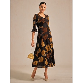 Dam Midiklänning Sammetsklänning Elegant Bröllopsgäst Cocktailfest Datum Normal Blommig Halvlång ärm V-hals Brun Vår Höst Vinter
