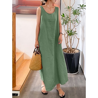Dam Maxiklänning Konstbomullslinne Skiftklänning Solklänning Grundläggande Ledigt Dagligen Semester Normal Slät Ärmlös Rund hals Gul Marinblå Grön Sommar