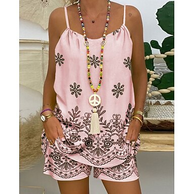 Kvinnors 2 delar mode streetwear dagligt shorts set ärmlös V-hals blommig grafisk dragsko avslappnad dagligt strand vit rosa blå sommar lös passform