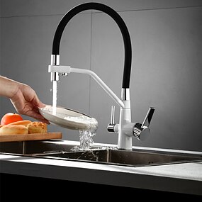 dubbla spakar köksreningskranar diskbänksblandare, 360 rotations vattenreningspip däckmonterad, dubbla handtag etthåls kärlkran med kall och varm slang