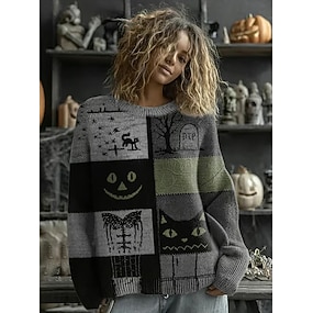 Halloween Women's Sweater Monster Cute Streetwear Casual Graphic Animal Crew Neck Patchwork Knitted Long Sleeve Regular Tops Knit Work Black+White+Gray Ginger Fall Winter