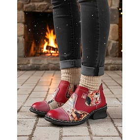 Women's Genuine Leather Red Handmade Ankle Boots with Artistic Print Patchwork, Comfortable Vintage Style Casual Chelsea Boots for Christmas, Winter Outfits & Holiday Gatherings