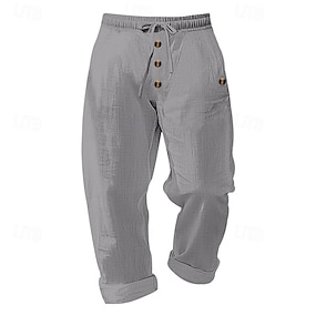 Men's Linen Pants Trousers Summer Pants Beach Pants Buttons Drawstring Elastic Waist Plain Comfort Breathable Full Length Casual Daily Holiday Fashion Classic Style Black White