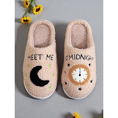 Women's White Plush Fleece House Slippers with Moon & Clock Embroidery – Warm Slip-On Scuff Mules for Bedroom Relaxation & Novelty Gifts